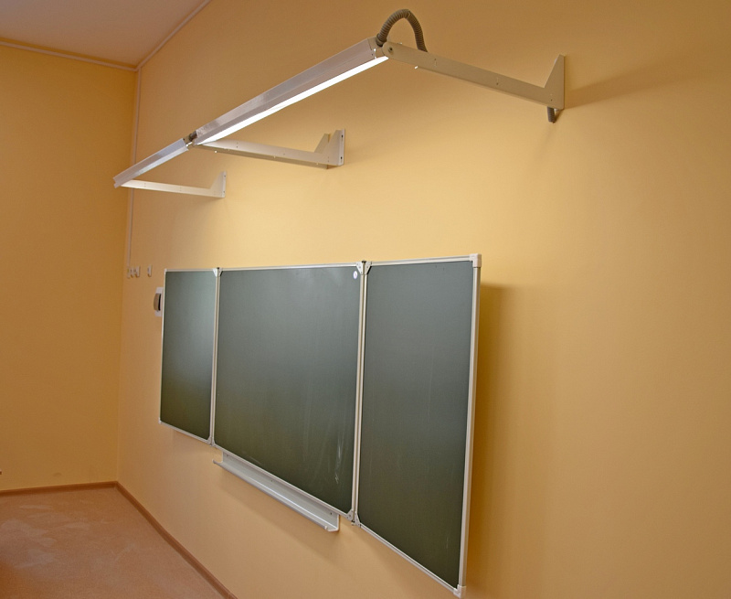 Специализированный светильник для учебных учреждений, включая учебные кабинеты общего и начального профессионального образования, групповых и спальных комнат детских учреждений акцентировано распределяет свет по поверхности доски, исключает ослепление учащихся. Имеют высокий показатель индекса цветопередачи (>90). Обеспечивает необходимую освещенность учебной доски - 500 Лк. Металлический корпус, усиленный конструкционными ребрами жесткости, изолированная секция для сквозной протяжки кабеля. Вынос кронштейна светильника относительно доски - 600 мм. Возможна регулировка угла наклона.